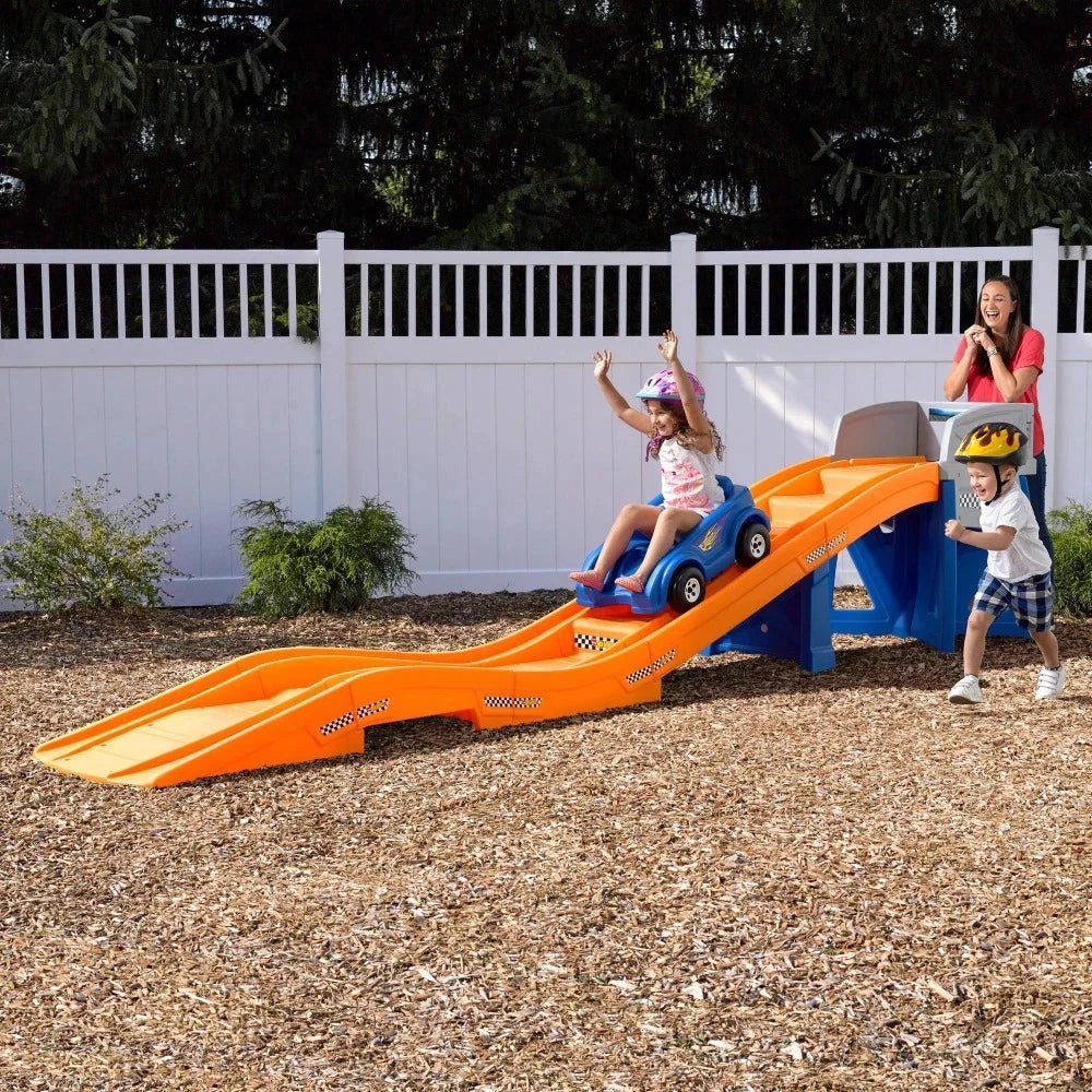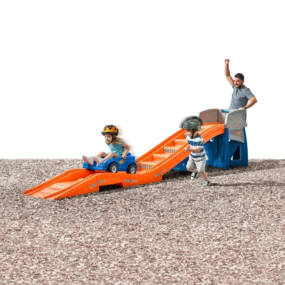 Little thrill seekers will love the cool Hot Wheels™ theme of this backyard roller coaster toy! The Hot Wheels™ Extreme Thrill Coaster™ by Step2 will be an instant neighborhood hit with 14 feet of coaster track and special Hot Wheels™ theme coaster car. The coaster car features a high back and footrests for a safe and secure ride with tons of thrills as toddlers and preschoolers coast down the track from the 30 in. high platform! They’ll practice gross motor skills by pushing the coaster car back up onto the platform, as well as balance and hand-eye coordination while riding the coaster car. Made in USA of US and imported parts. Made in USA of US and imported parts.