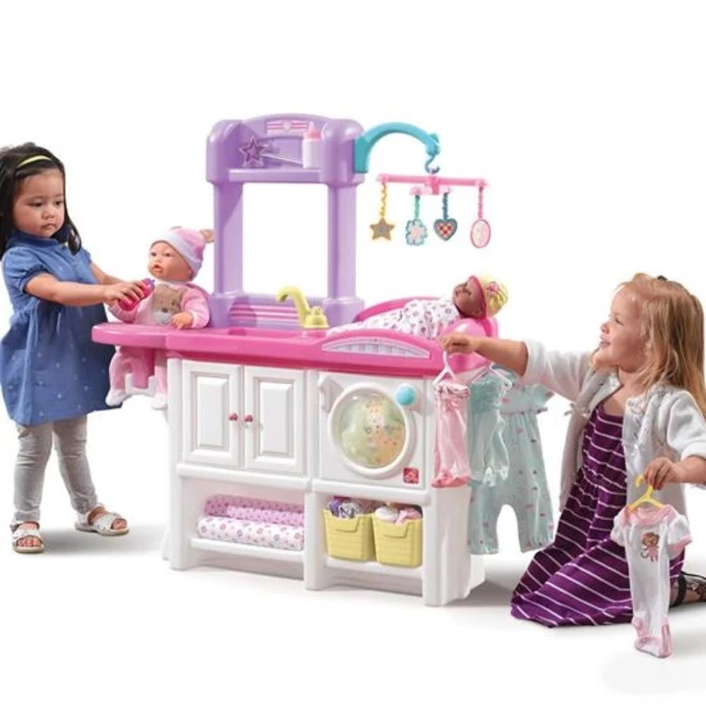 With this Step2 Doll Nursery, little ones will love playing mommy and daddy! This all-in-one nursery features everything toddlers will need to take care of their baby dolls. It helps foster nurturing play will be the perfect addition to any child’s playroom or bedroom! Made in USA of US and imported parts.