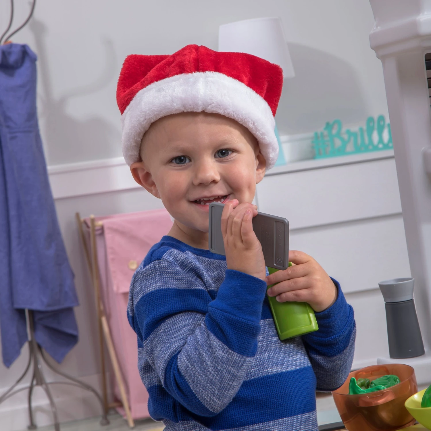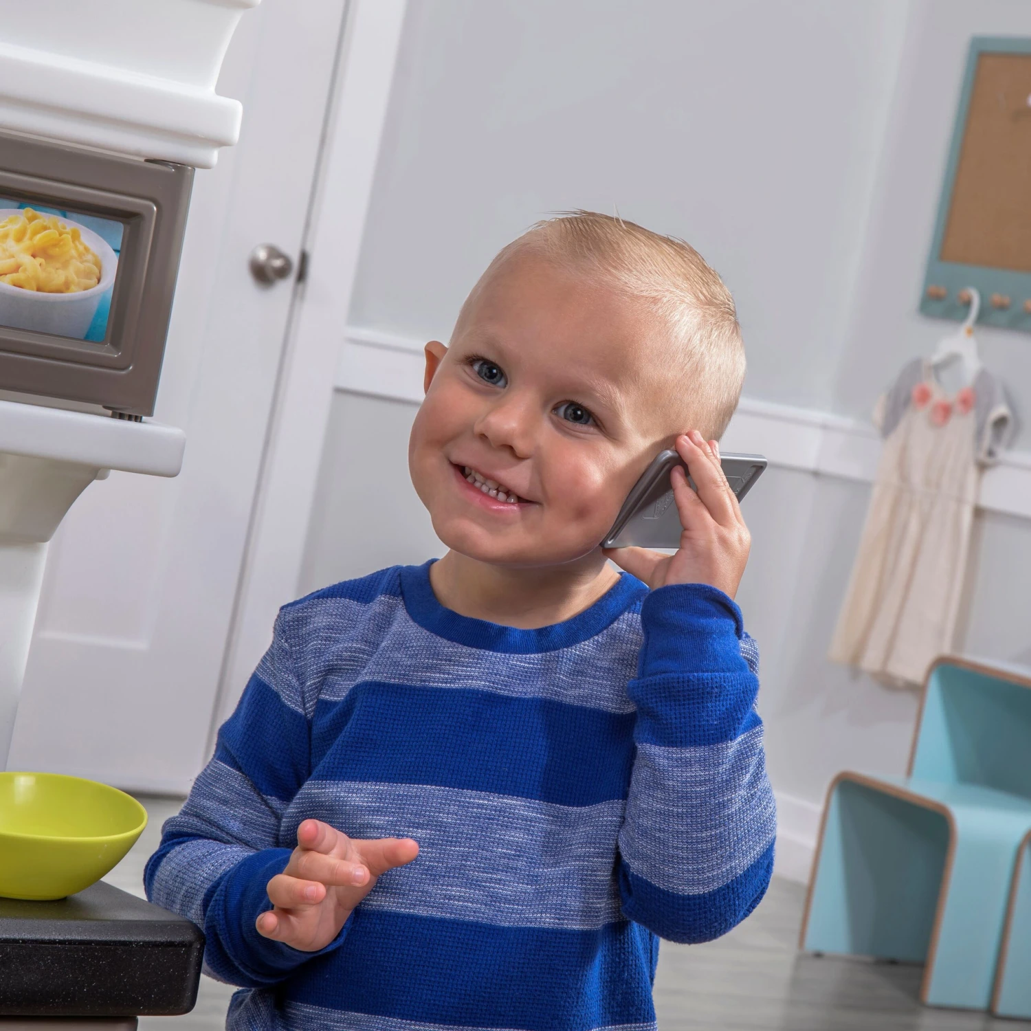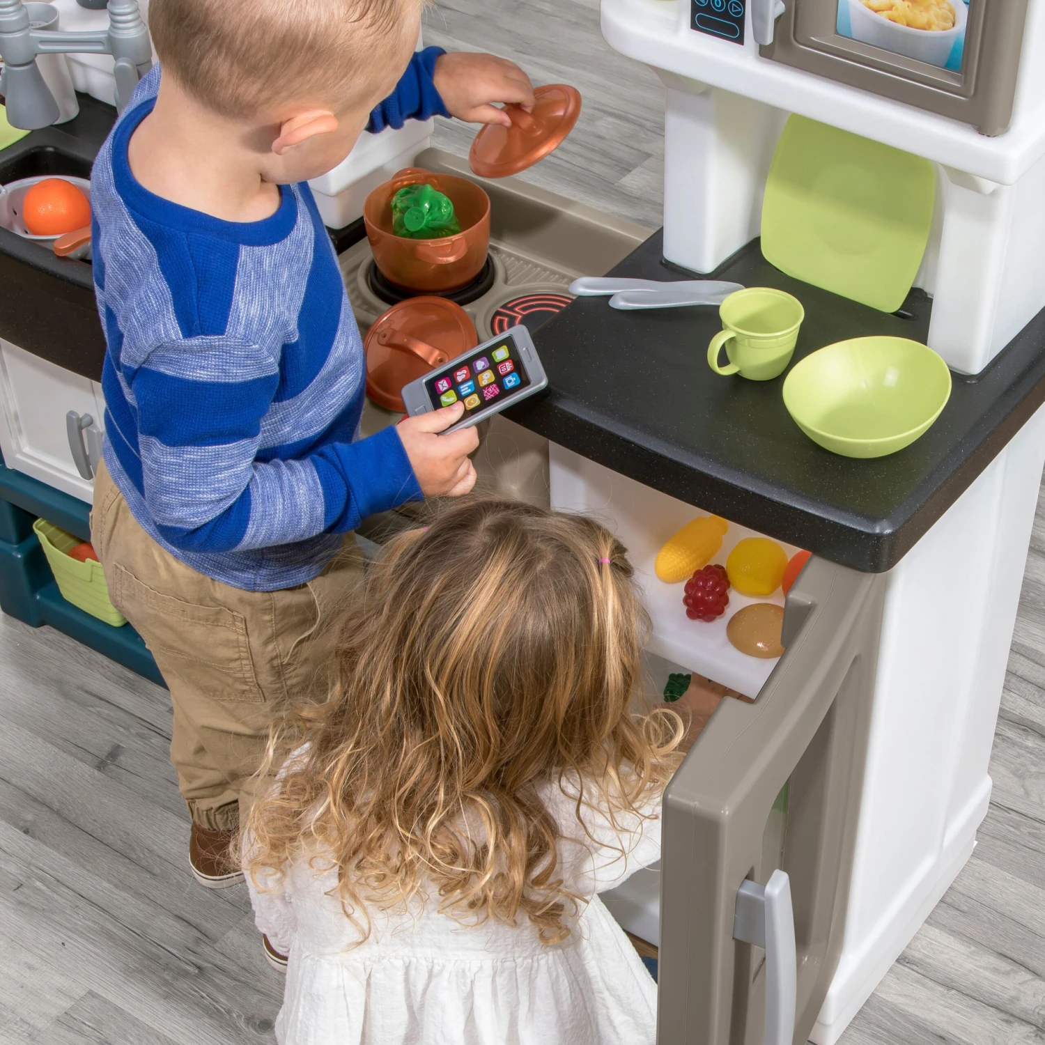 When the dishes are done and playtime is over, quickly clean-up by storing all cooking accessories in the lower-level cabinets. β Modern kitchen play set features premium slate-style appliance finishes! β Oversized refrigerator and oven feature look-through windows insets, just like today?s modern kitchen appliances β Kitchen stove features a stove hood with inset stacked-stone, just like the on-trend dΓ©cor of today?s home β Large, pass-thru window let?s little ones pretend to be their favorite restaurant β When dinner time is over, kiddos can ?rinse? their dishes in the farmhouse-style sink with gooseneck faucet β Extra amounts of storage space allow little ones to keep their kitchen neat and tidy after playtime fun is done! β Included 33-piece accessory set with a smartphone-style play phone β Requires 2 βAAβ batteries, not included β Adult assembly required