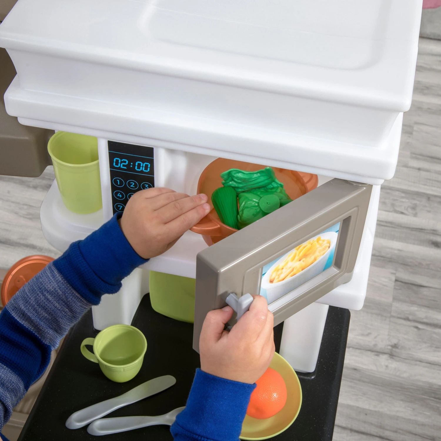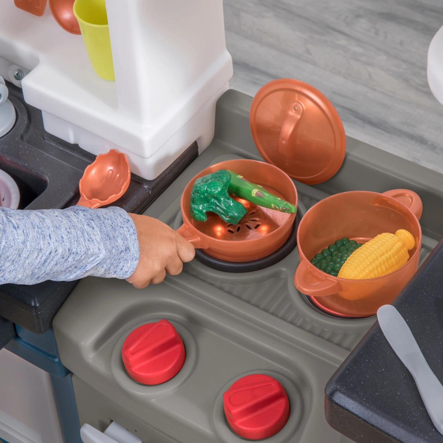 - Modern kitchen play set features premium slate-style appliance finishes!