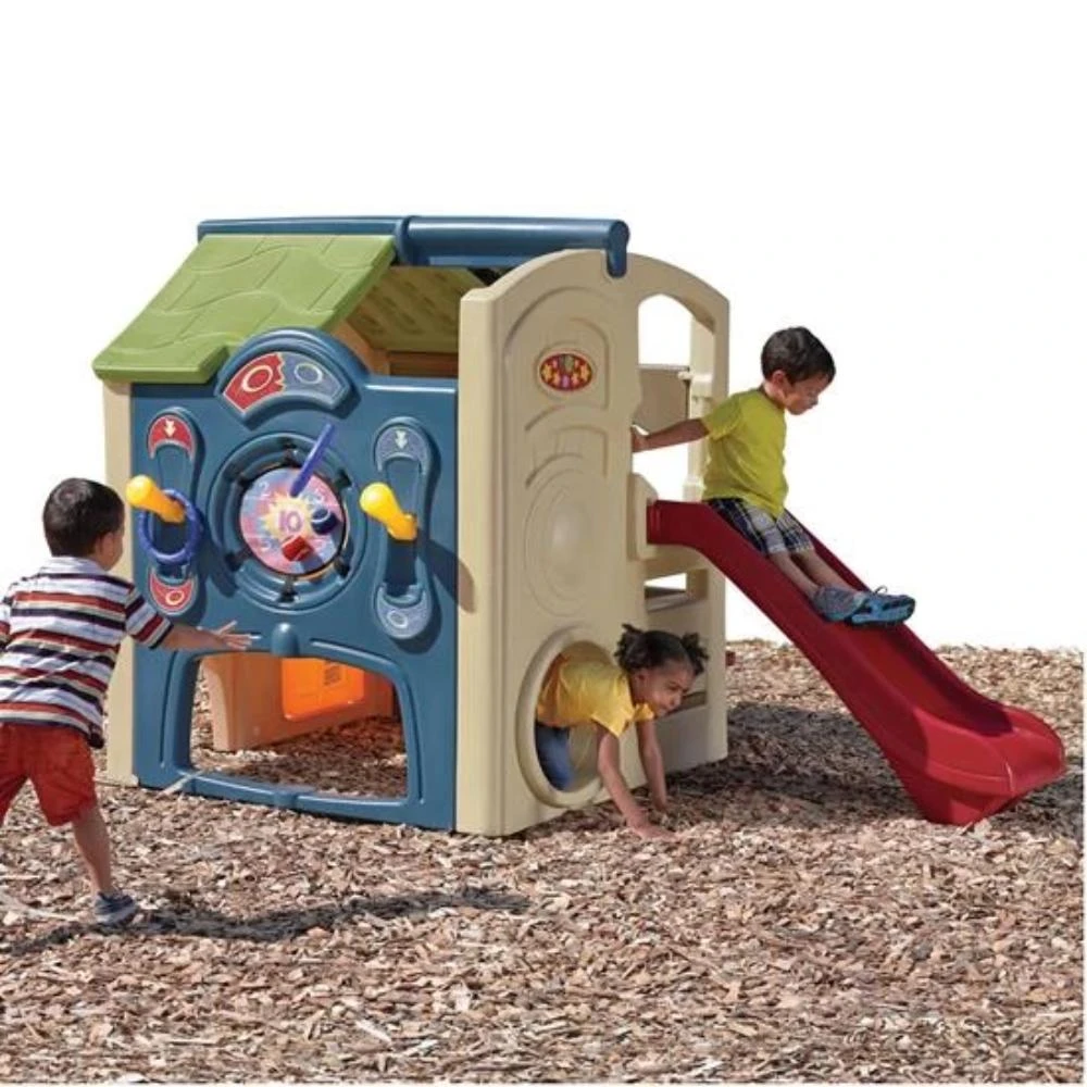 This Step2 Fun Center Playhouse is an all-in-one backyard activity center that will keep your tots busy and active! This play center features a slide and activity wall to promote youngsters’ gross motor skills, a built-in picnic table that’s perfect for snack time and a playhouse for imaginative play. The Neighborhood Fun Center will be the hit of the block! Made in USA of US and imported parts.