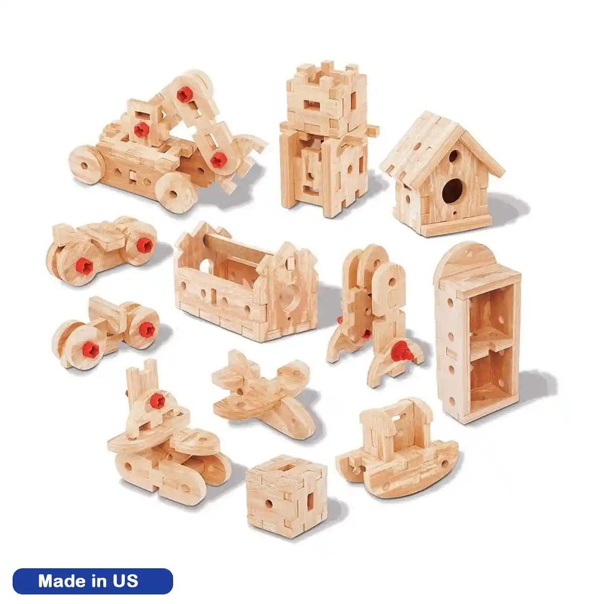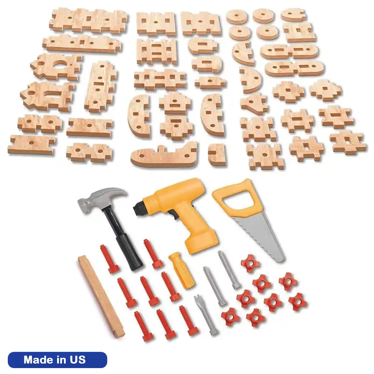 Encourage imaginative play with this award-winning realistic workbench! This set includes realistic ‘wood’ effect foam pieces with blueprint instructions to build a variety of models. You can even make a tool box to put the (included) tools in. The 65 piece accessory set is perfect for youngsters with busy hands, whilst the interlocking notches and holes for screws and nuts allow children to build with unlimited freedom.