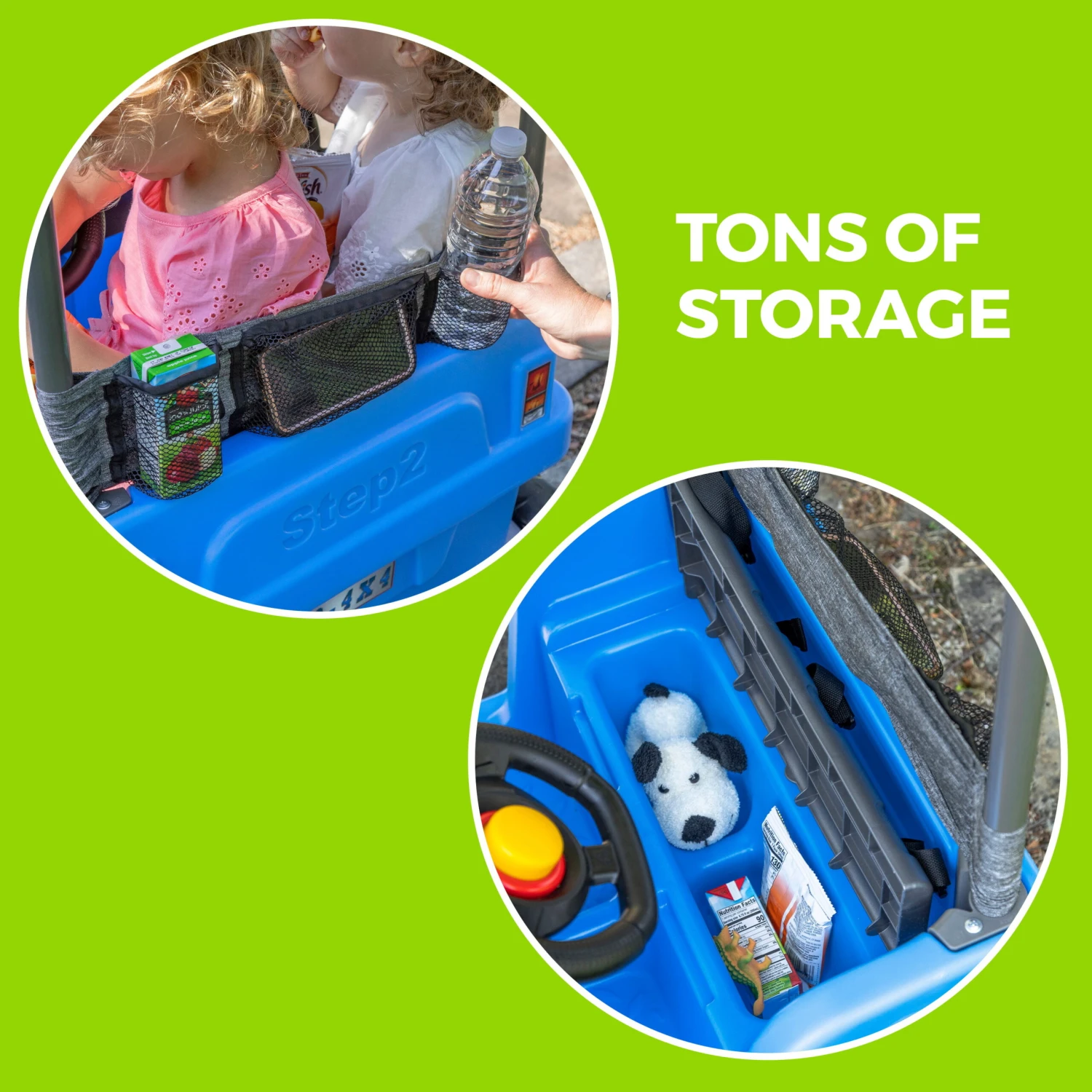 Buckle up with the two seat belts and fold the adjustable canopy down to lock into place for a shaded ride. Little ones can even pretend to drive their off-road dune buggy, each with their own steering wheel! There’s even extra storage for parents, too; store trip essentials in the mesh pockets on the back of the canopy base. Ready to ride? With this double-sided ride-on, walks around the neighborhood and beyond are a breeze!