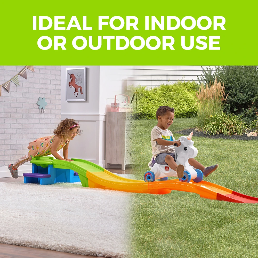 - In the box: Unicorn coaster car, 4-piece riding track, 2 steps.
