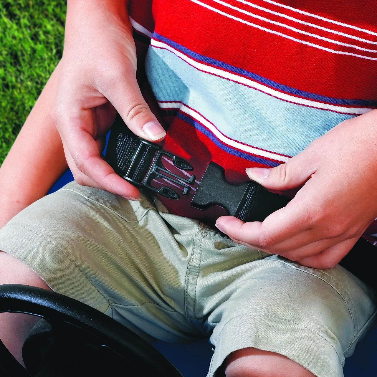 Buckle up with the included seat belt, pack some snacks in the under-hood storage, and use the cup holders for drinks located in the push handle and by the childβs steering wheel.