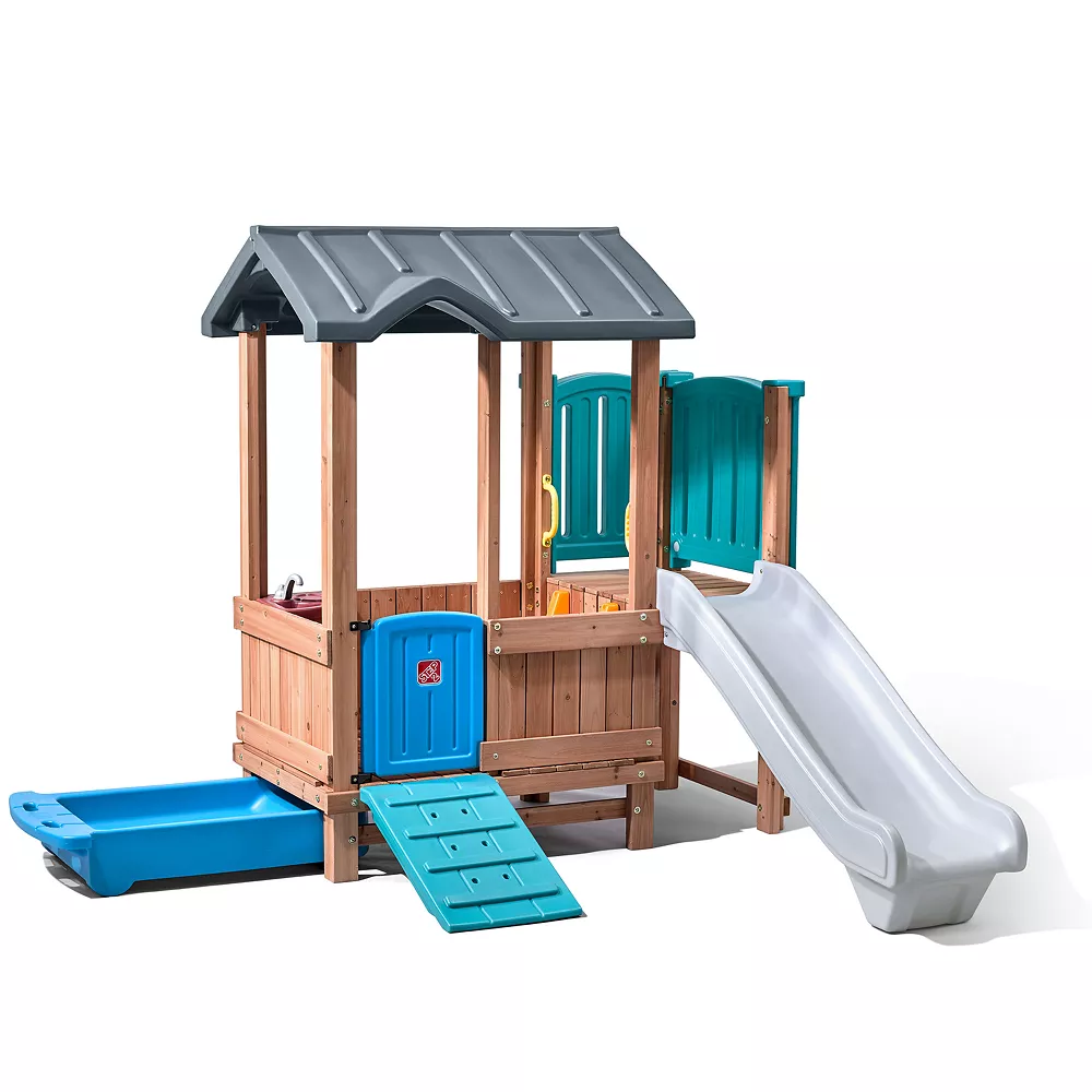 This Step2 Woodland Adventure Playhouse & Slide is an innovative playhouse with mixed materials and textures for a unique look!